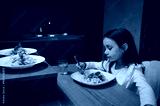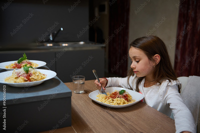 Little girl eating spaghetti dinner alone at home in a cozy kitchen