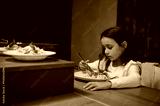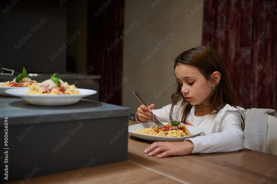 Young girl enjoying a plate of pasta at home in a cozy setting