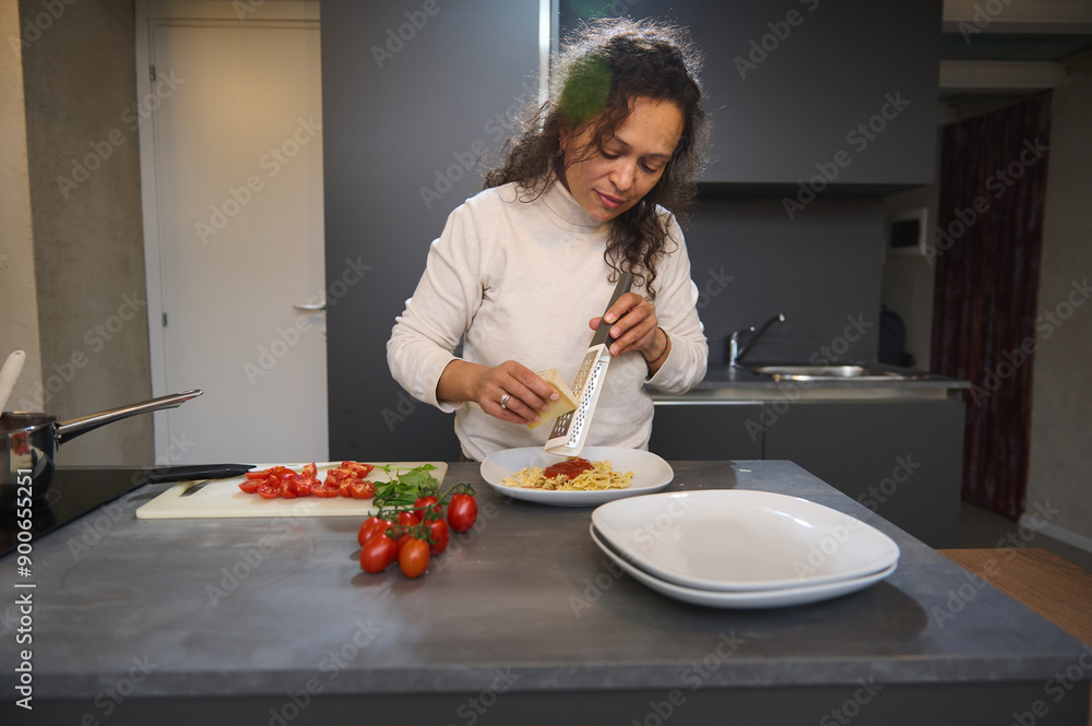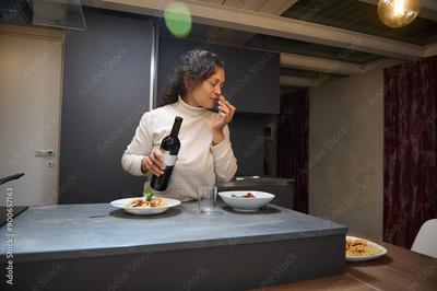 Woman enjoying pasta meal with red wine in modern kitchen