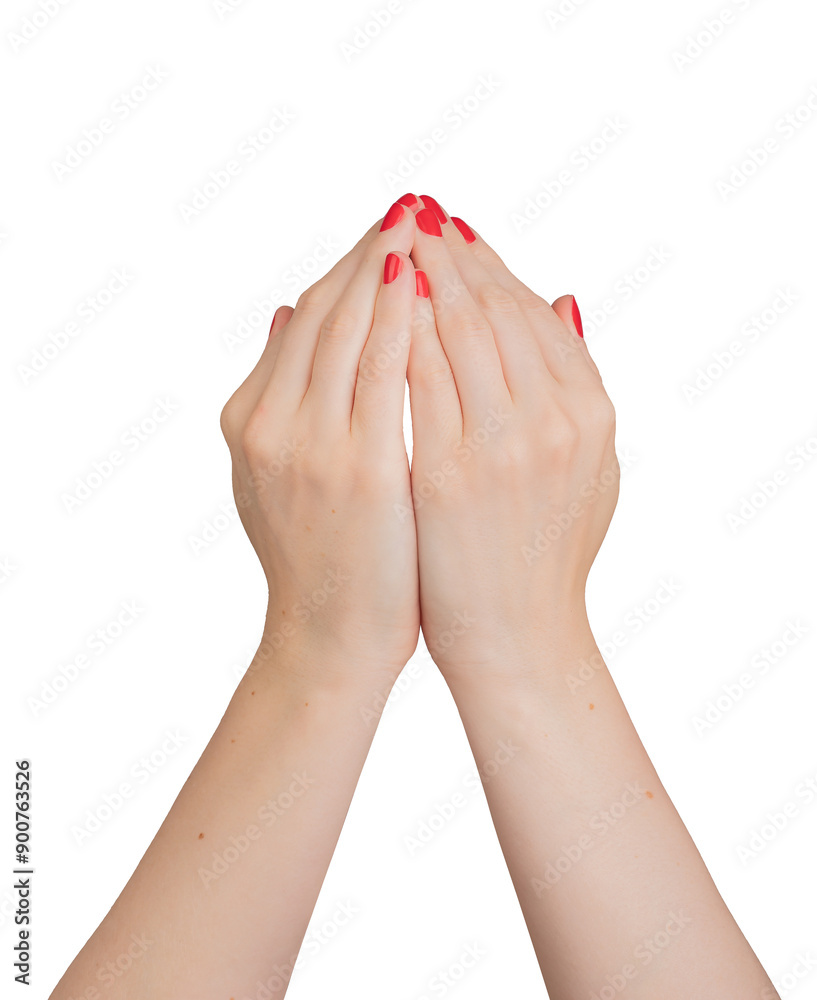 Hand gesture showing hidden or covered position. Both hands, with red manicure and elegant polish, covering or hiding something. Close-up of fingers and arms, showcasing delicate., transparent PNG