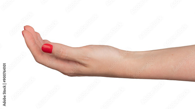 Cupped hand with palm up, symbolizing charity and help. Elegant and delicate gesture, showing care and support. Isolated on white background, with varnished nails and a beautiful,., transparent PNG