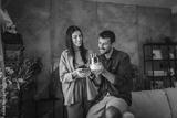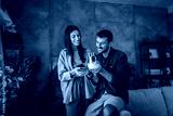 Adult couple connect cctv surveillance camera with mobile phone at home