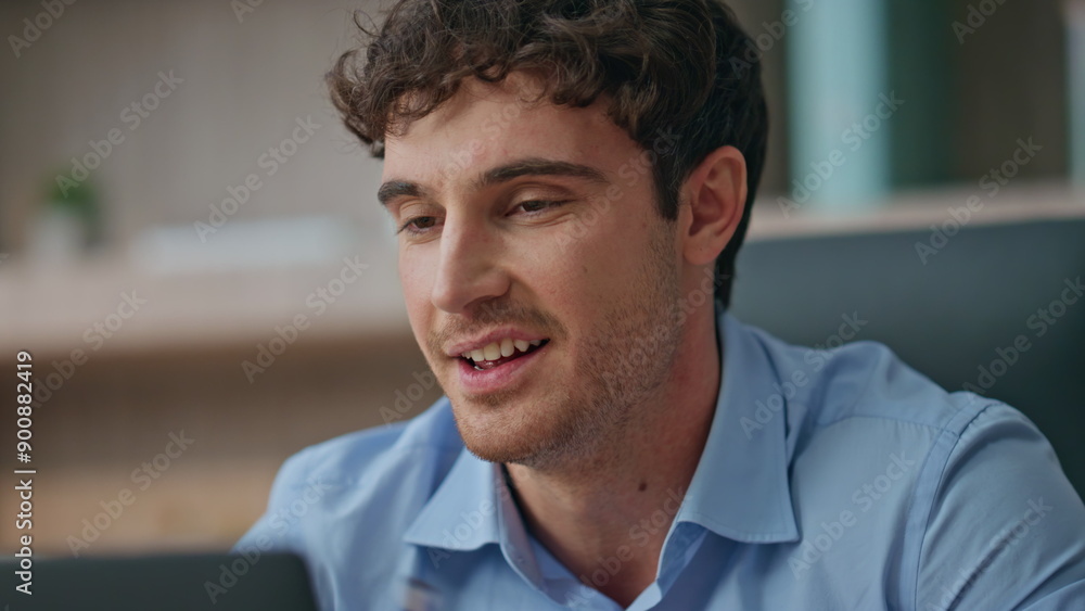 Relaxed employee communicating laptop online. Closeup it manager working office