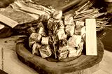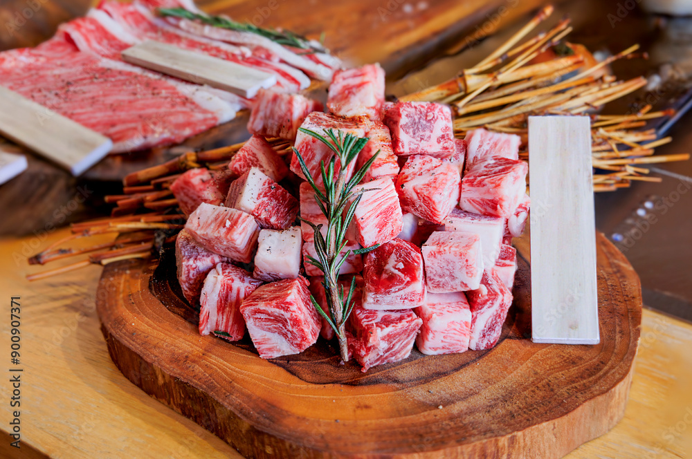 cubed raw meat on wooden plate shabu shabu culinary with wooden sticks and name plate food photography