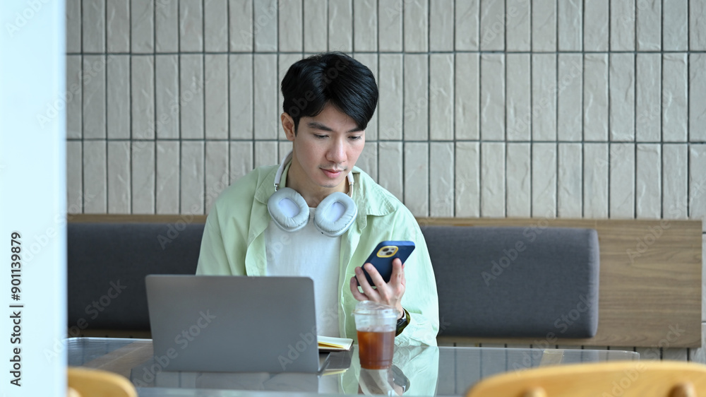 Young asian man sitting with laptop at desk in coffee shop and using mobile phone