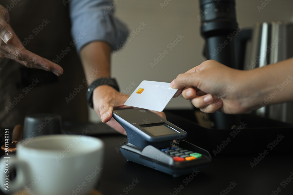 Close up view of customer hand tapping credit card on a contactless payment terminal at modern coffee shop