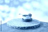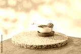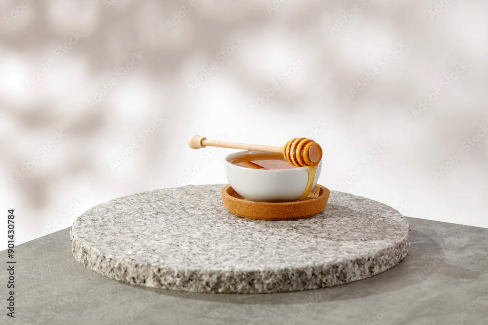 Honey with honey dipper in white cup on stone marble plate on a table and white wall with natural sunlight background copy space for products.