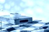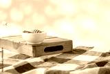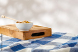 Honey with honey dipper in white bowl on wooden tray on kitchen cloth on a table and white wall with natural sunlight background copy space for products.
