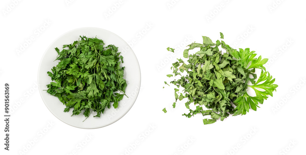 Dry parsley pile isolated. Crushed cilantro leaves heap, dried garden parsley, chervil flakes, corriender pileces