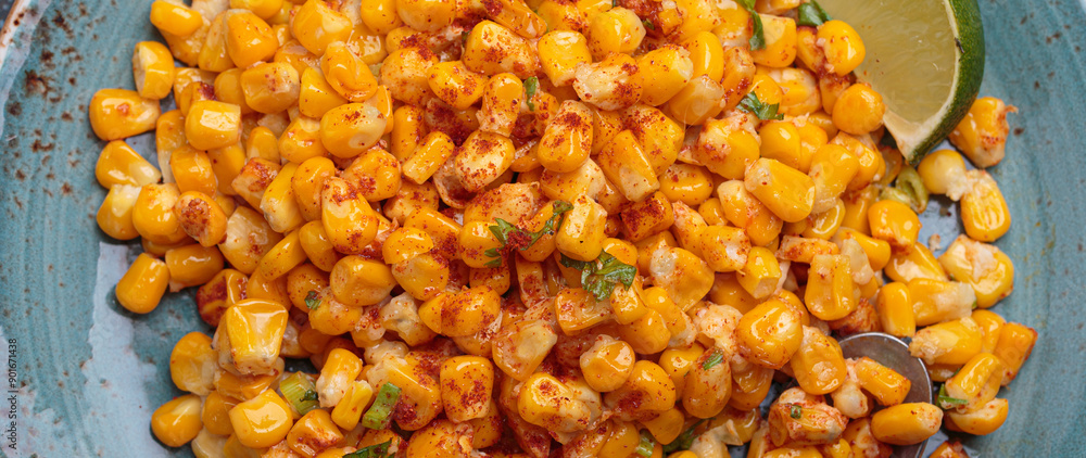 Esquites is a popular mexican street food dish made with grilled corn kernels, mayonnaise, cheese, chili powder, and lime juice, served on plate
