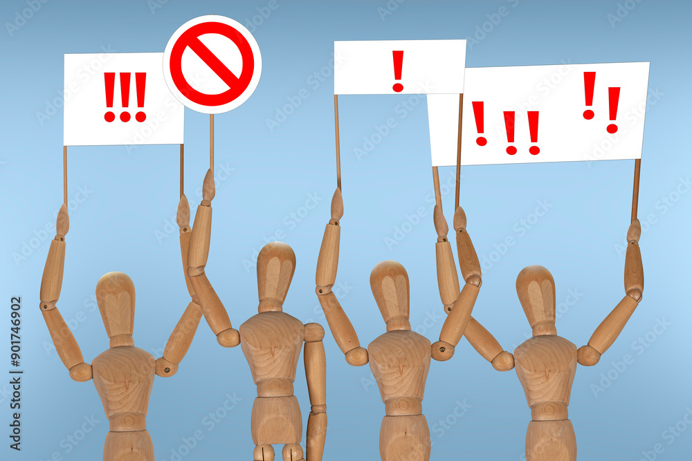 A wooden puppet doll marionette holding protest sign. Concept of emotional manipulation, world conspiracy theories., control and dictatorship.