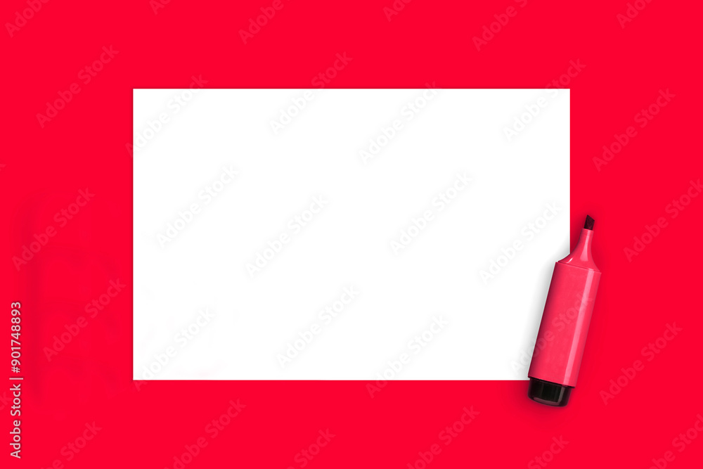 Sheet of paper, red marker felt-tip pen template for art, mock up for design, clean empty blank copy space background.