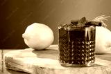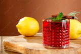 Red fruit cold brew water drink with fresh rosemary and mint leaves in glass on wooden table and brown background.