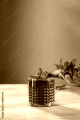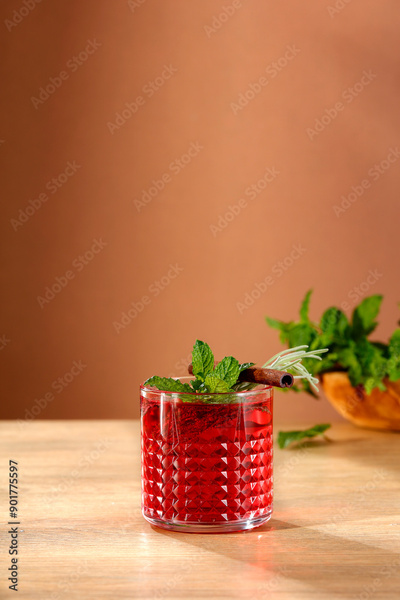 Red fruit cold brew water drink with fresh rosemary and mint leaves in glass on wooden table and brown background.