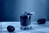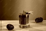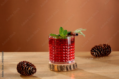 Red fruit cold brew water drink with fresh rosemary and mint leaves in glass on wooden table and brown background.