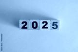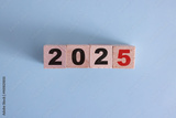Wooden cube block with 2025 text on table background. Resolution, plan, review, goal, start and New Year holiday concepts