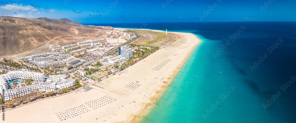 White sandy beach and blue water in Morro Jable, south of Fuerteventura, Canary islands