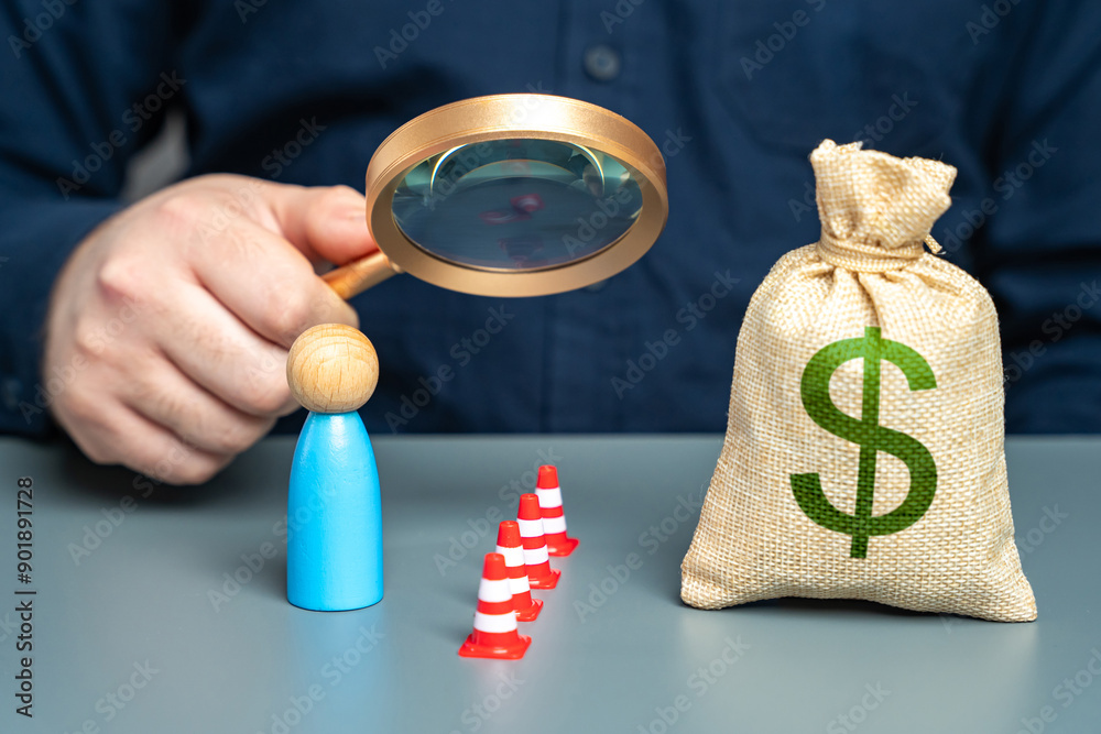 The businessman studies the barriers to access to financial funds, money markets, capital, loans and mortgages. Help to reclaim money back.