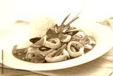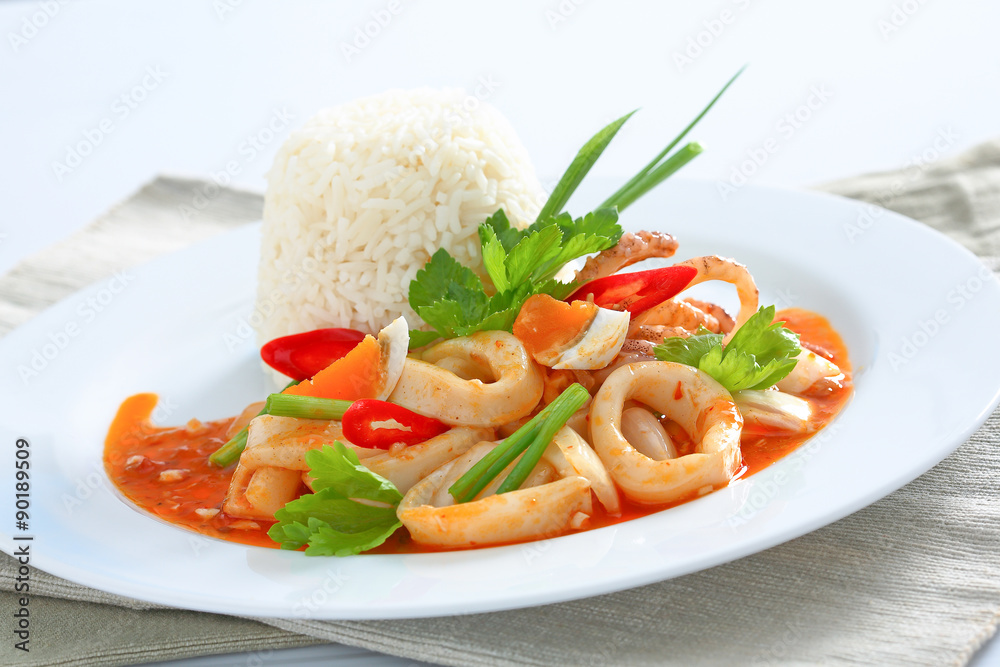 Stir fried squid with salted egg yolk over rice, Thai food