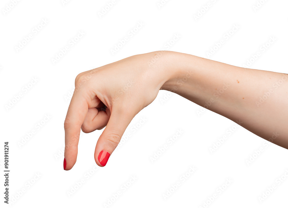 Hand reaching out, as if holding or grabbing an invisible object. Isolated on white background, showcasing a gesture for measuring or evaluating size and space. Closeup of a