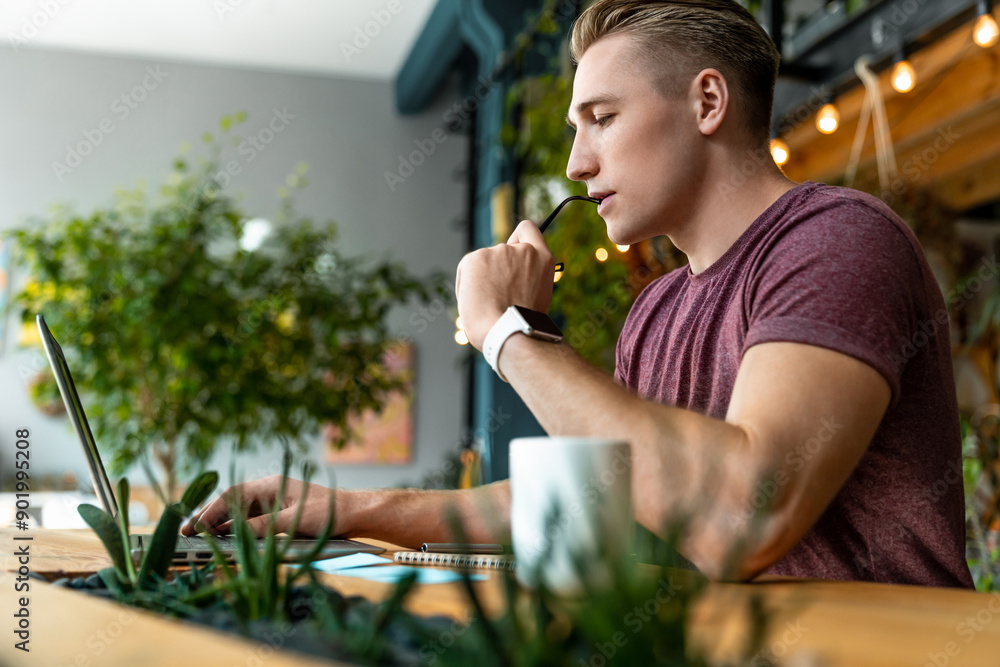 Thoughtful caucasian young man student freelancer manager worker with eyewear in hand using laptop while working remote distant studding learning online at coworking office modern cage campus
