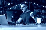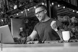 Cheerful young man manager student raise arm looking happy while working studding on laptop reading message received great news opportunity job promotion celebrating business success win result