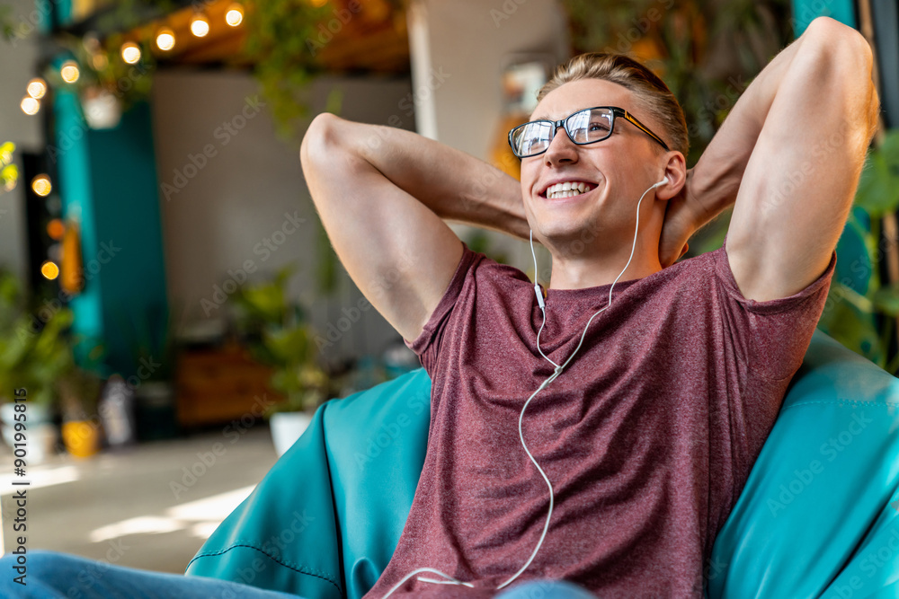 Cheerful young man freelancer it marketing worker designer student manager intern relaxing listening music podcast e-book taking break after work study at workplace in modern office loft cafe.