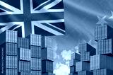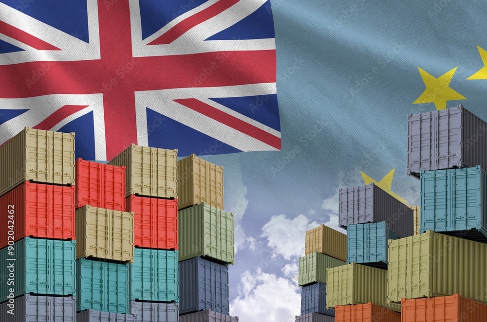 Tuvalu flag and big stack of shipping cargo containers in docks with sky background close up