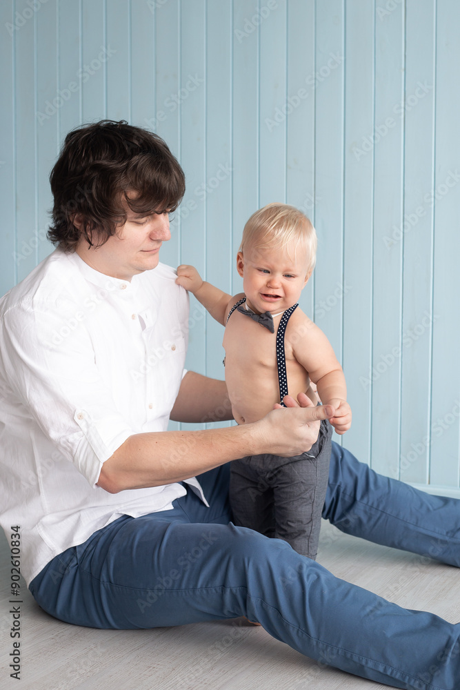 Family, father and son baby boy hugging at home while sitting near blue wall. Happy parents.