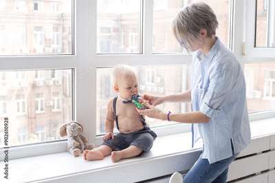 Young happy mother with baby son feeding fruit puree, while sitting near window at home, happy family
