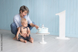 Happy family, mother and her son little baby boy on his first birthday sitting on floor next to the cake on the stand, with the number one next to him, smash cake party