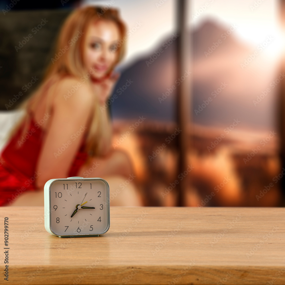 An alarm clock on wooden countertop with copy space. Blurred cozy atmosperic and nostalgic bedroom background with warm evening sublight and a young woman sitting in bed.