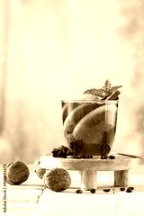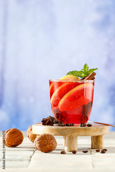 Mulled wine in a glass with cinnamon and fresh mint and cloves on a wooden table against the background of a blurred festive snowy winter background. A warming drink on a cold frosty day.