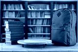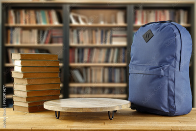 Books in library and wooden table desk with blue backpack and copy space for products and school supplies.