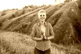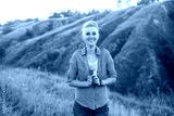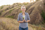 Portrait of smiling young woman with short haircut hairstyle wearing blue shirt in nature outdoors on sunset near green hills