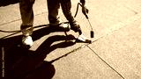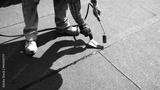 Roofer preparing part of bitumen roofing felt roll for melting by gas heater torch flame
