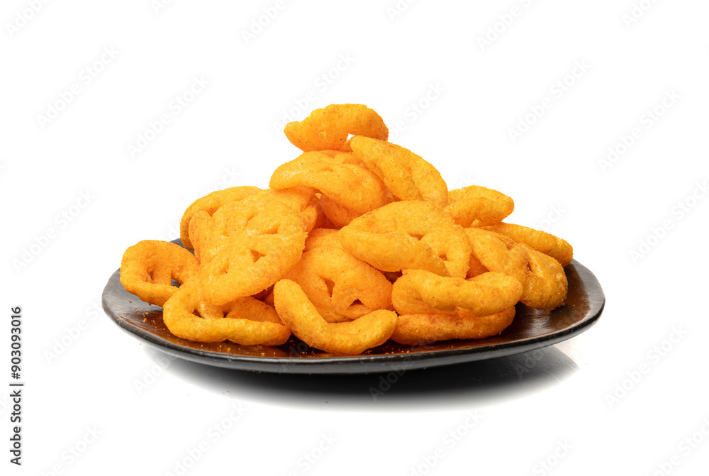 Corn puff snack isolated, crunchy cereal nosh, crispy yellow rice breakfast with paprika