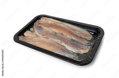 Dutch herring packaging isolated, salted fish meat fillet, traditional maatjes, raw atlantic herring, matias