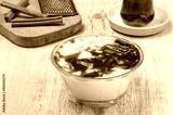 Traditional Turkish baked rice pudding called Fırında Sütlaç in glass bowl on white wooden board with Turkish tea and a cutting board with cinnamon sticks and a grater in the background