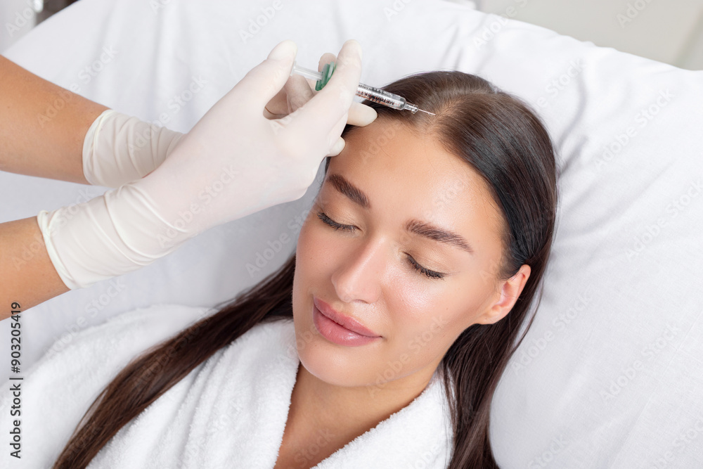 Lady receiving hair mesotherapy injections from professional trichologist. Hair treatment in cosmetology using injections for hair growth