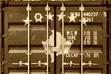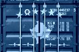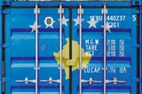 Kosovo flag depicted on metal doors of shipping cargo container outdoors in docks area close up