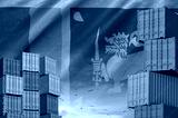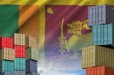 Sri Lanka flag and big stack of shipping cargo containers in docks with sky background close up