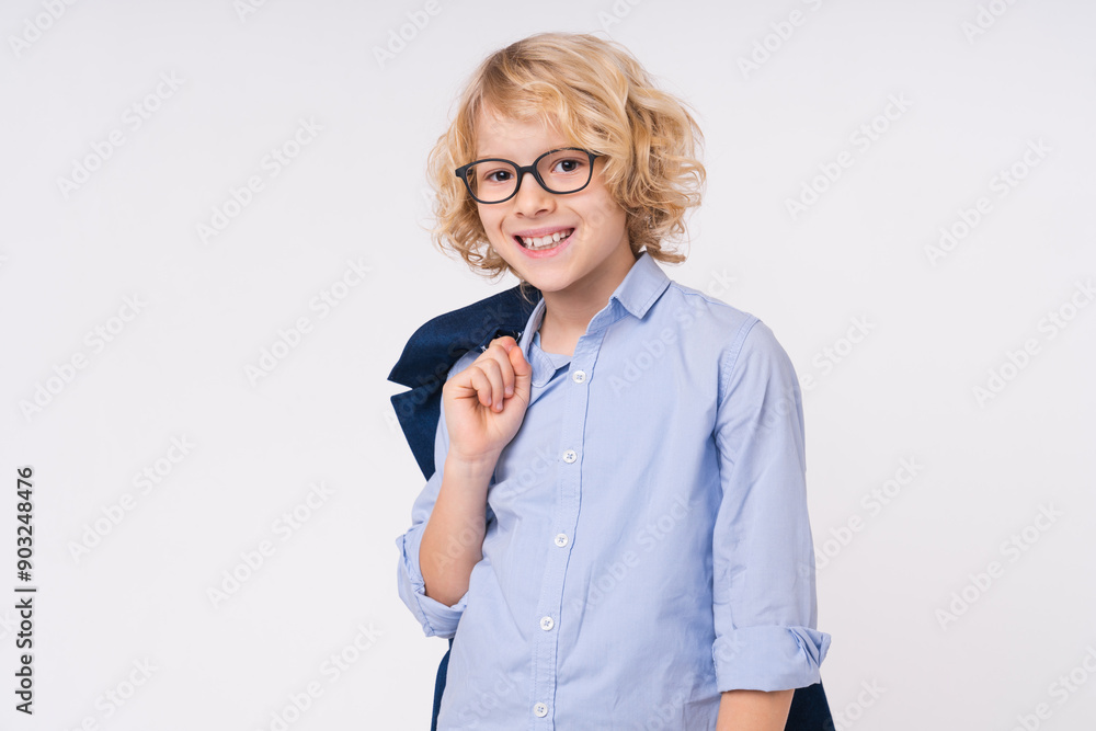 Successful preteen caucasian boy kid child elementary primary middle school pupil wearing formal clothes suit uniform in eyeglasses standing isolated on white background. Education concept