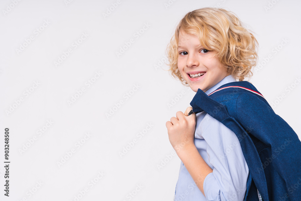 Side view portrait of a caucasian blonde preteen boy male child kid elementary primary middle school pupil in formal clothes suit uniform isolated on white background copy space. Education concept