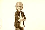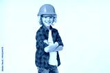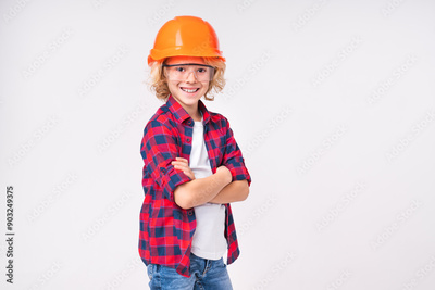 Confident caucasian little small preteen boy male child kid elementary primary middle school pupil teenager future construction worker in hardhat protective helmet isolated over white background
