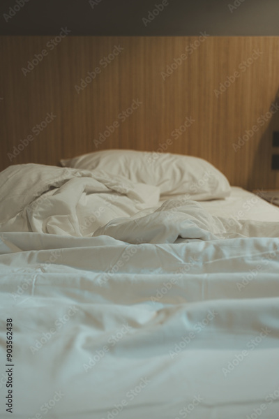 White cloth view of bedroom and blanket bed sheet after use with wrinkle in hotel