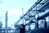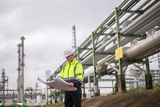 Engineer drinking water tried form work holding tablet computer standing in front of industrial facility, possibly a refinery or chemical plant, engaged in a job that requires high safety standards.