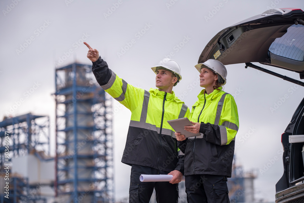 Engineers wear uniform and helmet stayed behind car hand holding blueprint paper show, survey inspection work plant site use tablet see detail of work with oil refinery background.