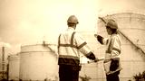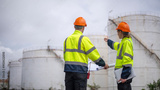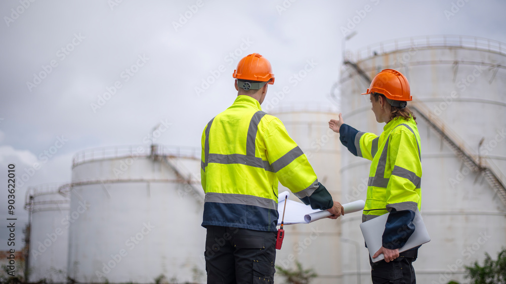 Engineers wearing safety gear, including hard hats examining survey a large blueprint laptop standing industrial facility oil refinery engaged in a job that requires high safety standards.