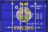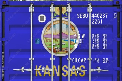 Kansas US state flag depicted on metal doors of shipping cargo container outdoors in docks area close up